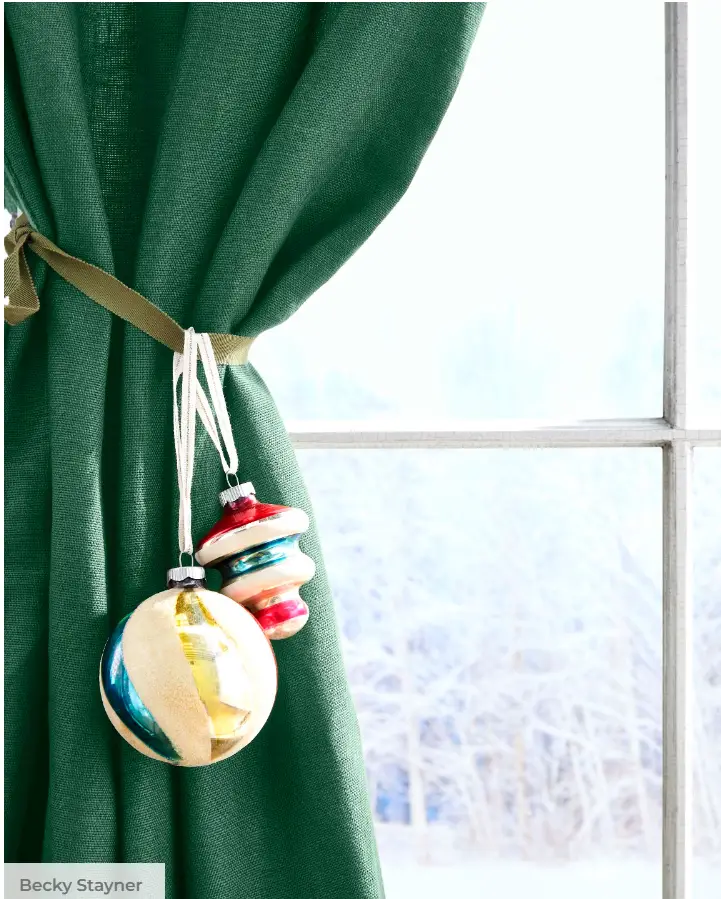 Donnez une touche d’élégance instantanée et facile à vos rideaux en passant simplement des rubans dans les boucles de quelques Shiny Brites et en les nouant autour de vos embrasses.
