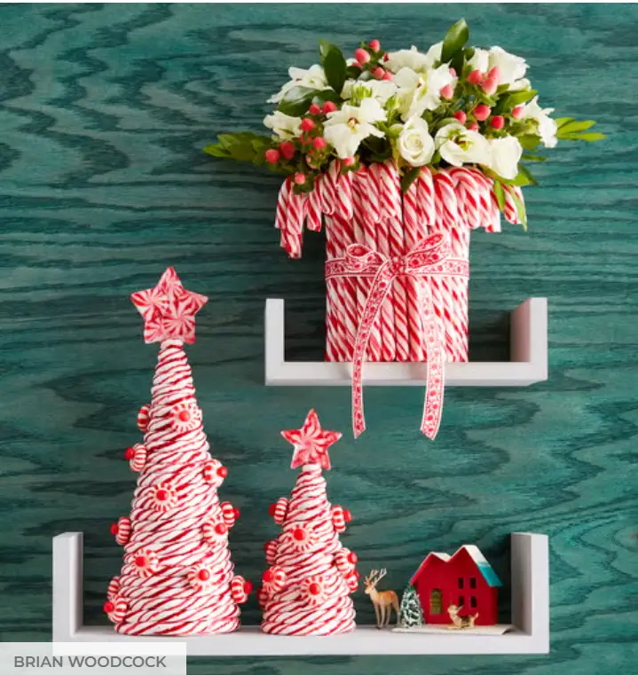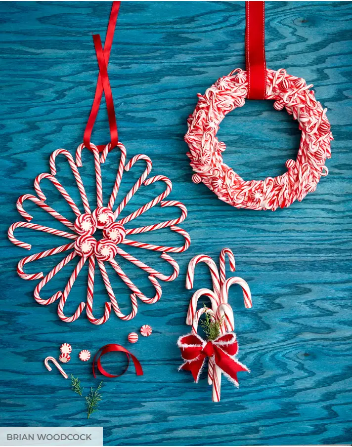 Pour réaliser la couronne en haut à droite : enroulez un support en mousse de 30 cm de diamètre avec un ruban blanc. Fixez des bâtonnets de sucre d’orge, des petits sucres d’orge et des boules de menthe poivrée avec de la colle chaude pour dissimuler le support. Passez un ruban autour du haut de la couronne pour la suspendre.