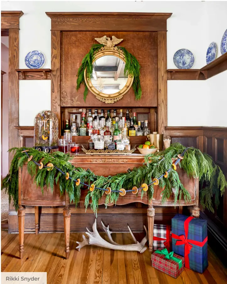 Enfilez des tranches d’agrumes séchées sur un joli ruban à carreaux et disposez-les sur un lit de verdure. Drapez-les autour des fenêtres, sur les escaliers, les cheminées ou un meuble (comme ce buffet, présenté ici).