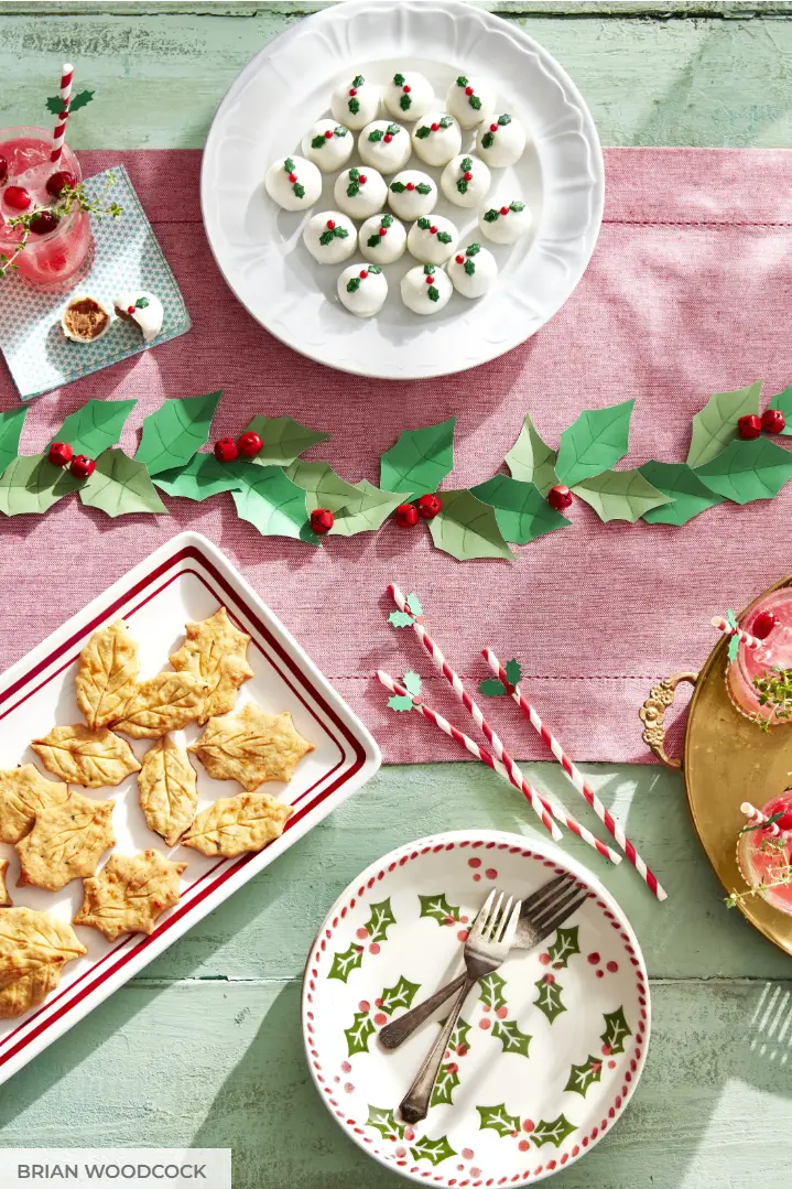 Pour réaliser cette décoration : découpez des feuilles de houx dans du papier cartonné vert foncé et vert clair. À l’aide d’un plioir ou d’une brochette en bois, marquez les nervures des feuilles, puis repassez-les au crayon vert. Disposez-les au centre de la table et parsemez-les de grelots rouges.