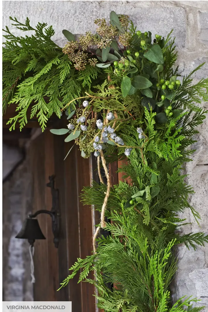 Cette guirlande à plusieurs niveaux, confectionnée avec des branches de cèdre frais et de vigne, est festive et dégage un parfum délicieux.
