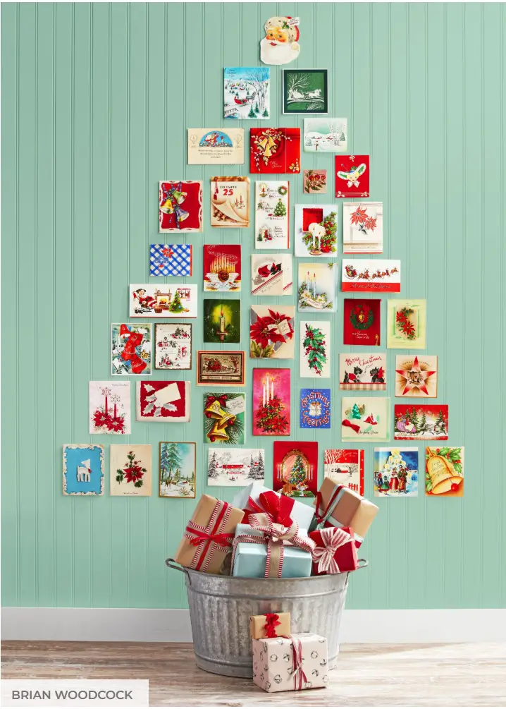 Rassemblez le courrier de Noël, ancien et nouveau, dans une installation en forme de sapin. Placez un seau galvanisé en dessous pour y déposer les cadeaux à envoyer, les petits présents ou le reste du courrier des fêtes.