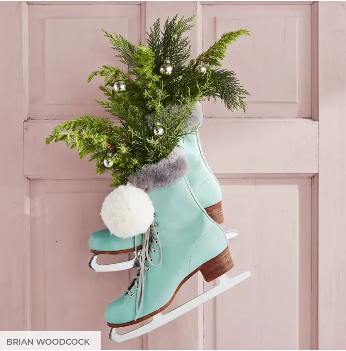 Comment résister à l’envie d’orner sa porte de patins à glace recouverts de fourrure et remplis de verdure fraîche ? Une boule de neige en pompon duveteux et de mini-ornements argentés complètent cette décoration de porte élégante.