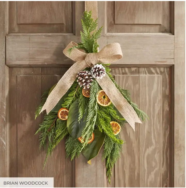 Pour réaliser cette décoration : rassemblez des brins de cèdre et de vigne frais de 30 cm de long et attachez-les ensemble avec du fil de fer vert. Répétez l’opération jusqu’à obtenir la quantité nécessaire pour faire le tour de l’encadrement de la porte. Fixez les fagots entre eux en les faisant se chevaucher à l’aide du fil de fer vert. Suspendez la décoration au-dessus de la porte à l’aide de clous ou de crochets. Décorez avec des baies et des pommes de pin.