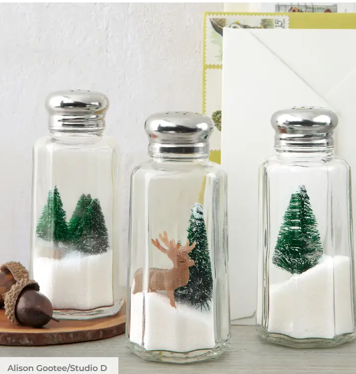 Voici une idée pour les fêtes de fin d’année qui vaut vraiment le coup : transformez des salières et poivrières de moins d’une livre en mini-paysages hivernaux en y disposant des sapins miniatures et des cerfs miniatures sur des « drapeaux » iodés.