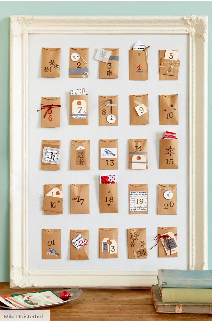 Comptez les jours jusqu’à Noël avec de petites enveloppes en papier , de la taille idéale pour contenir toutes sortes de surprises : bonbons, billets, petits jouets. Utilisez des tampons pour inscrire les dates sur les enveloppes. Vous pouvez aussi les décorer avec des étiquettes, de la ficelle et du ruban adhésif décoratif. Ensuite, il suffit d’épingler les enveloppes sur un joli tableau en liège.
