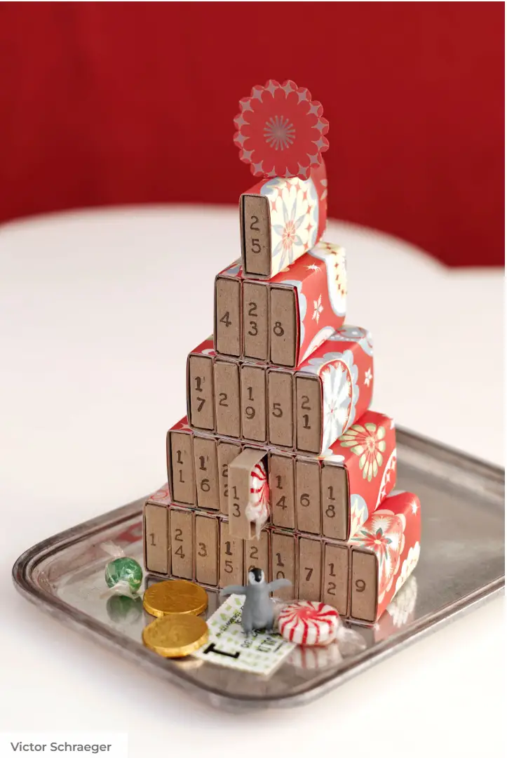 Utilisez des boîtes d’allumettes ordinaires pour compter les jours jusqu’à Noël. Collez les couvercles des boîtes vides les uns aux autres avec de la colle chaude pour former des rangées (commencez avec neuf boîtes pour la base, puis diminuez de deux à la fois jusqu’à obtenir une seule boîte). Découpez du papier cadeau pour recouvrir chaque section et fixez-le avec de la colle chaude. Ensuite, collez les rangées en forme de pyramide, comme illustré.