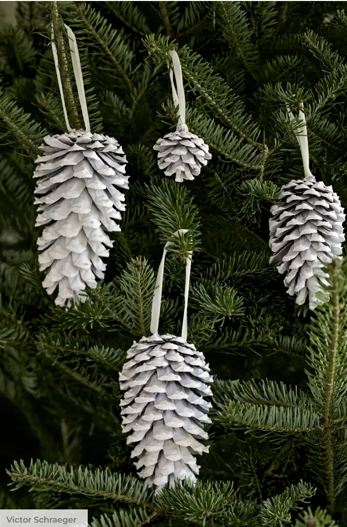 Peintes en blanc à la bombe, les pommes de pin ressortent magnifiquement sur les sapins, les guirlandes et les couronnes. Pour un effet scintillant, saupoudrez-les de paillettes tant que la peinture est encore fraîche.