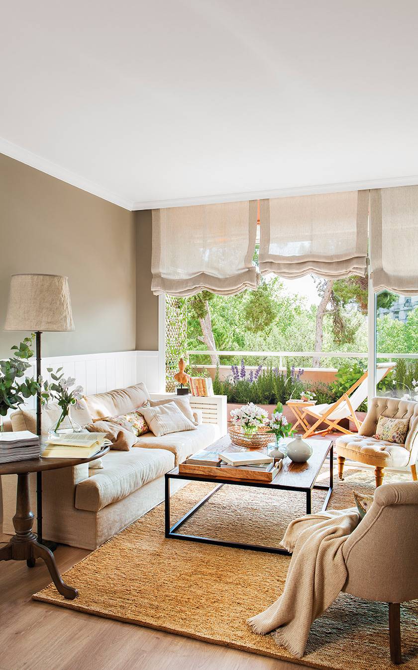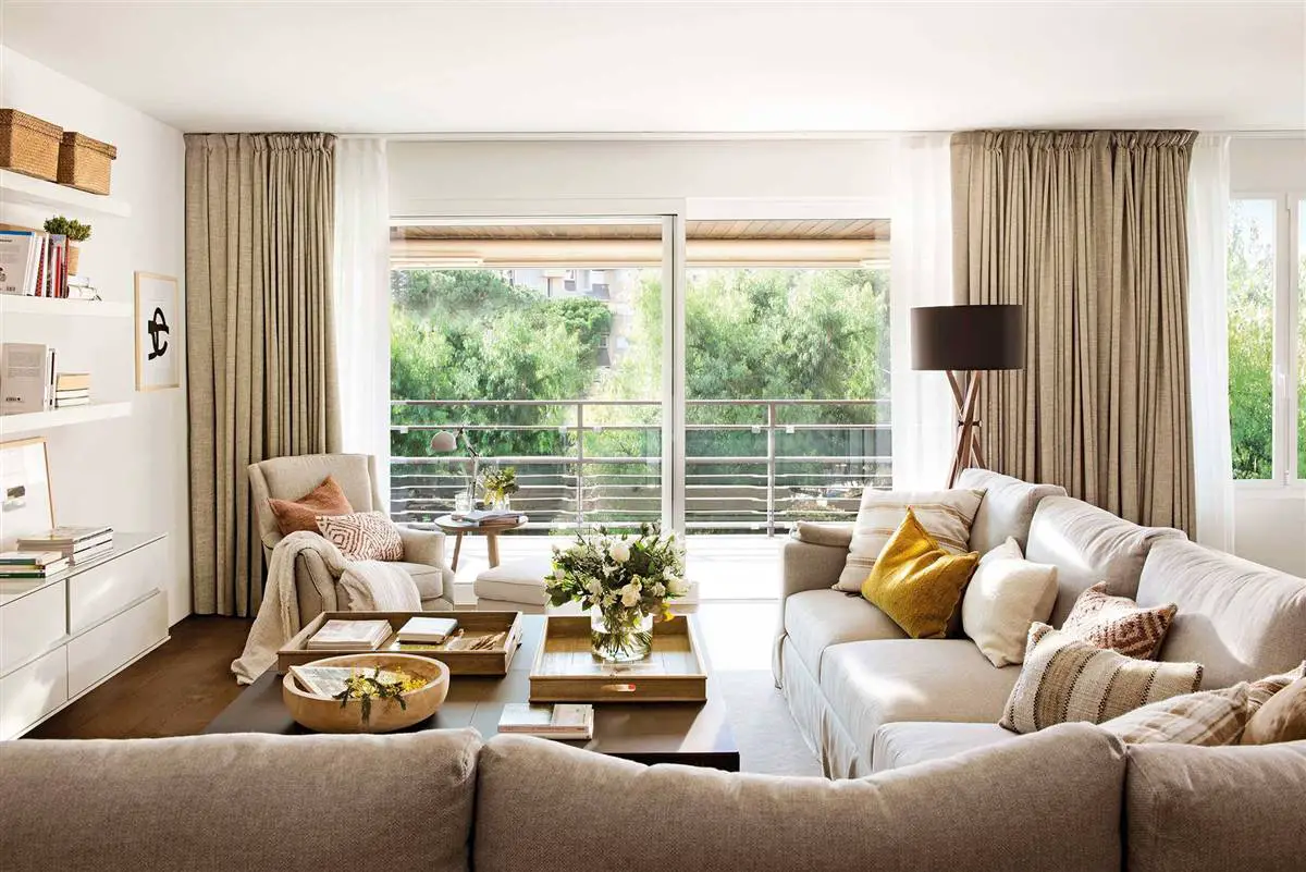 Un magnifique salon aux tons neutres. La lumière agrandit visuellement l’espace, et les stores permettent d’ouvrir la grande fenêtre pour profiter de la vue.