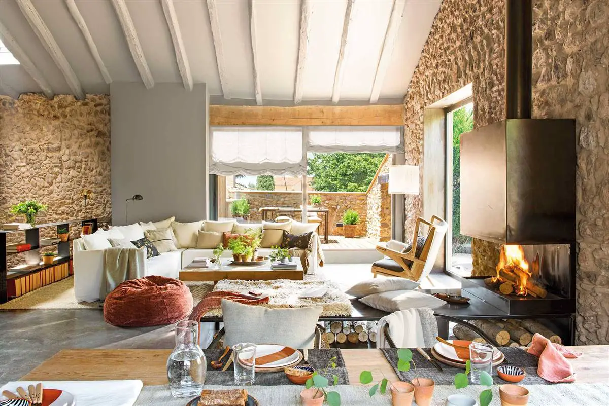 Ce salon allie modernité et style rustique. Les murs en pierre et le plafond en bois blanchi forment un écrin parfait pour la cheminée en métal noir qui, avec le coin salon, ancre la pièce dans le XXIe siècle.