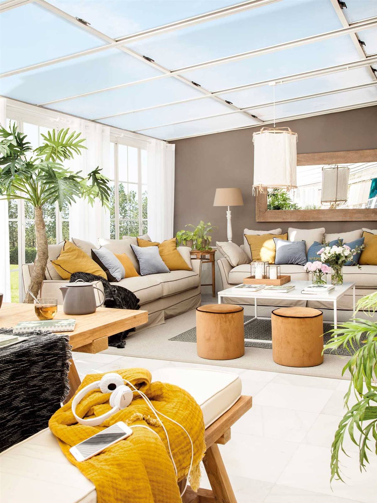 Le toit de ce salon est en polycarbonate, laissant passer la lumière tout en isolant de la chaleur. De plus, il s’ouvre et se ferme. C’est un salon qui donne l’impression d’être sur une terrasse !