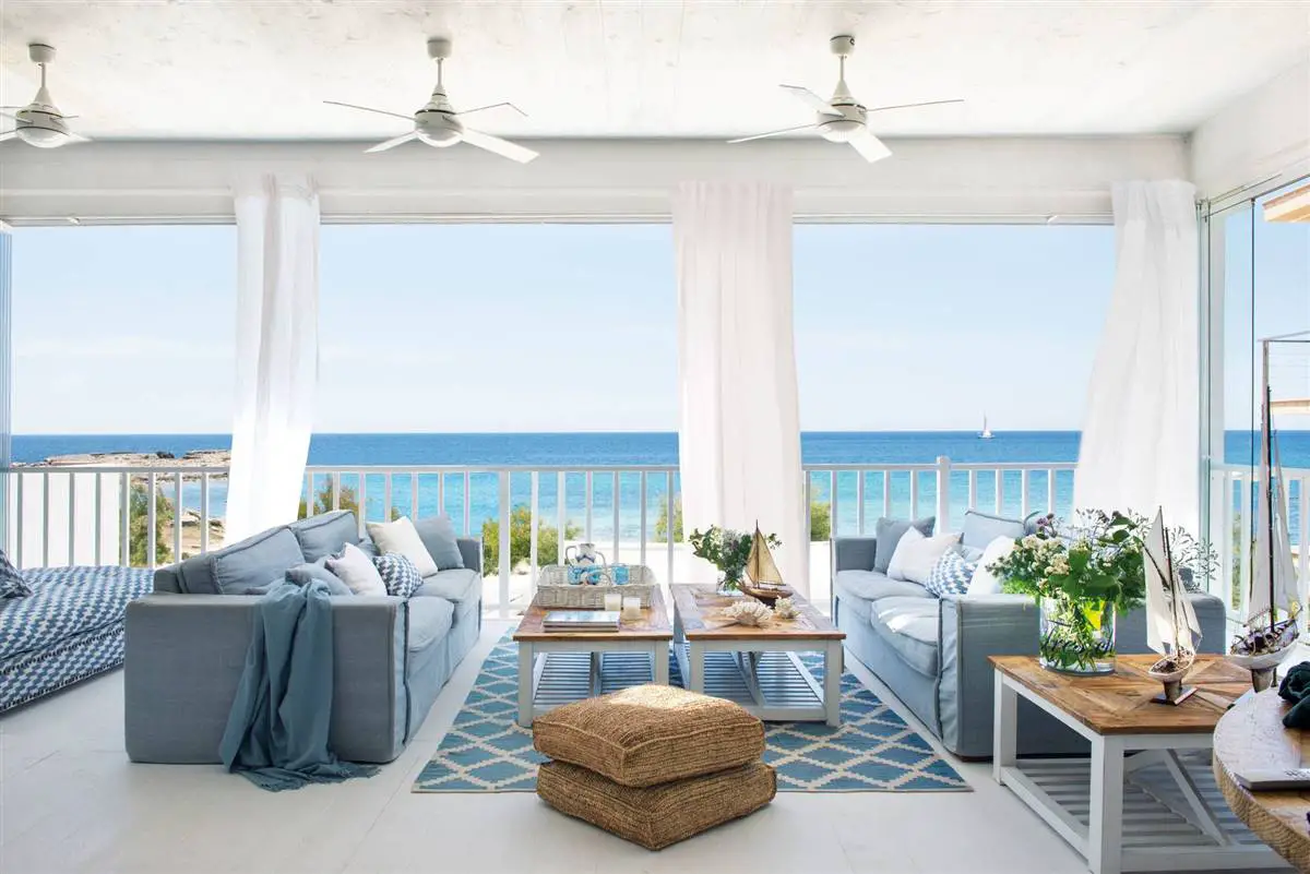 Dans ce salon, les fenêtres apparaissent et disparaissent comme par magie. L’air marin s’infiltre ainsi à travers les tissus, se fondant harmonieusement avec eux.