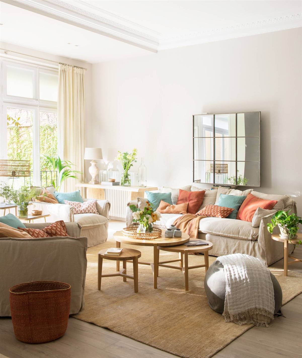 Ce salon est parfaitement adapté à son époque. Sur un fond neutre, les canapés laissent toute leur place aux coussins turquoise et rouille. L’ensemble de trois tables gigognes rondes se distingue et contribue au confort général de la pièce.