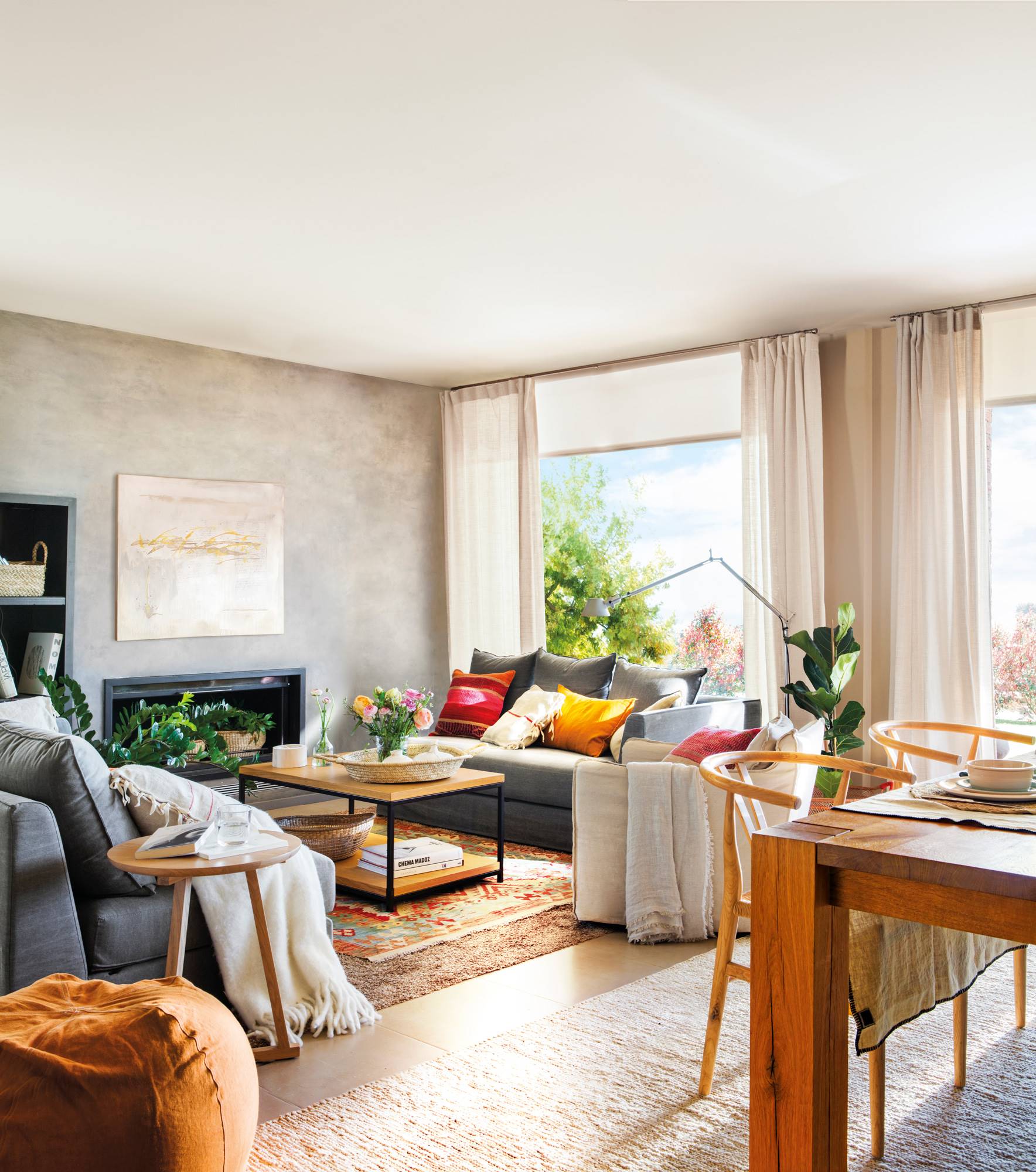 Dans cette maison, le salon partage l’espace avec la salle à manger et, malgré la petite taille de l’espace, une atmosphère agréable a été créée grâce aux canapés disposés face à face et à la cheminée comme point central.