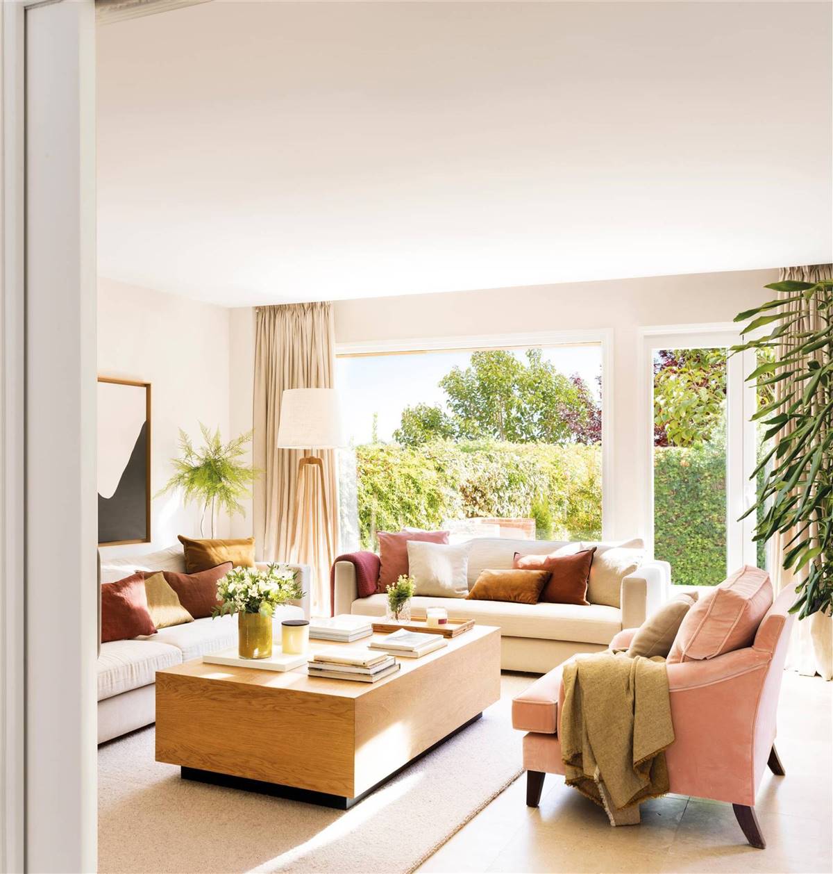 Avec son style contemporain indéniable, ce salon est lumineux, chaleureux et résolument féminin. On le doit notamment à la grande fenêtre qui se trouve derrière l’un des canapés, aux tissus d’ameublement clairs, à la table basse aux lignes épurées et aux détails déclinés dans différentes nuances de rose.