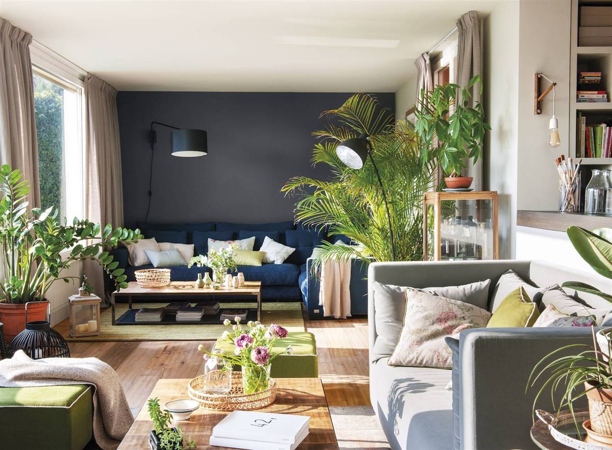 Dans ce salon, le bleu règne en maître. Couleur de l’année 2020, le bleu classique a vu sa popularité croître progressivement. Ici, outre le mur d’accent, le canapé qui y est adossé est également revêtu de velours bleu. Les plantes et le bois contribuent à réchauffer cette teinte froide.