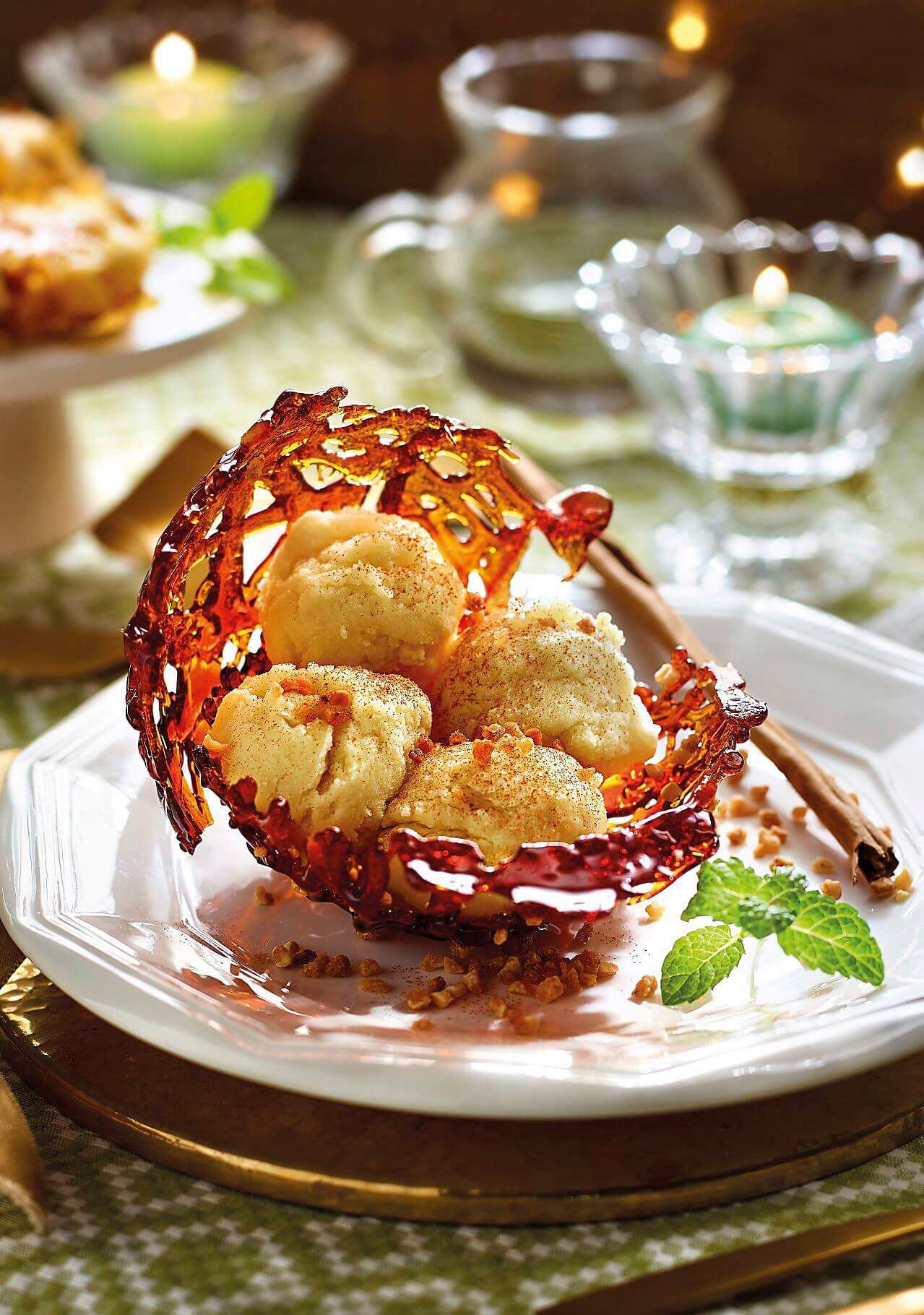 L’astuce : Sortez la glace du congélateur quelques minutes avant de servir. Répartissez les dômes dans les assiettes, garnissez-les de glace et décorez de crumble et de cannelle.