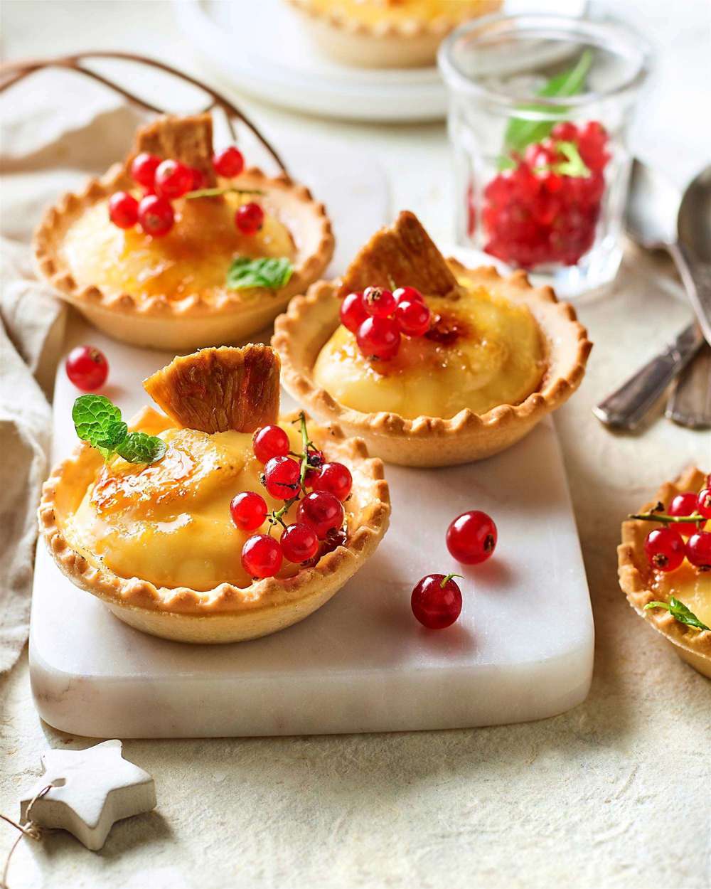 L’astuce : Au moment de servir, garnissez les tartelettes. Saupoudrez la crème de sucre et caramélisez-la au chalumeau. Coupez l’ananas en tranches et caramélisez-le de la même façon. Décorez comme sur la photo.