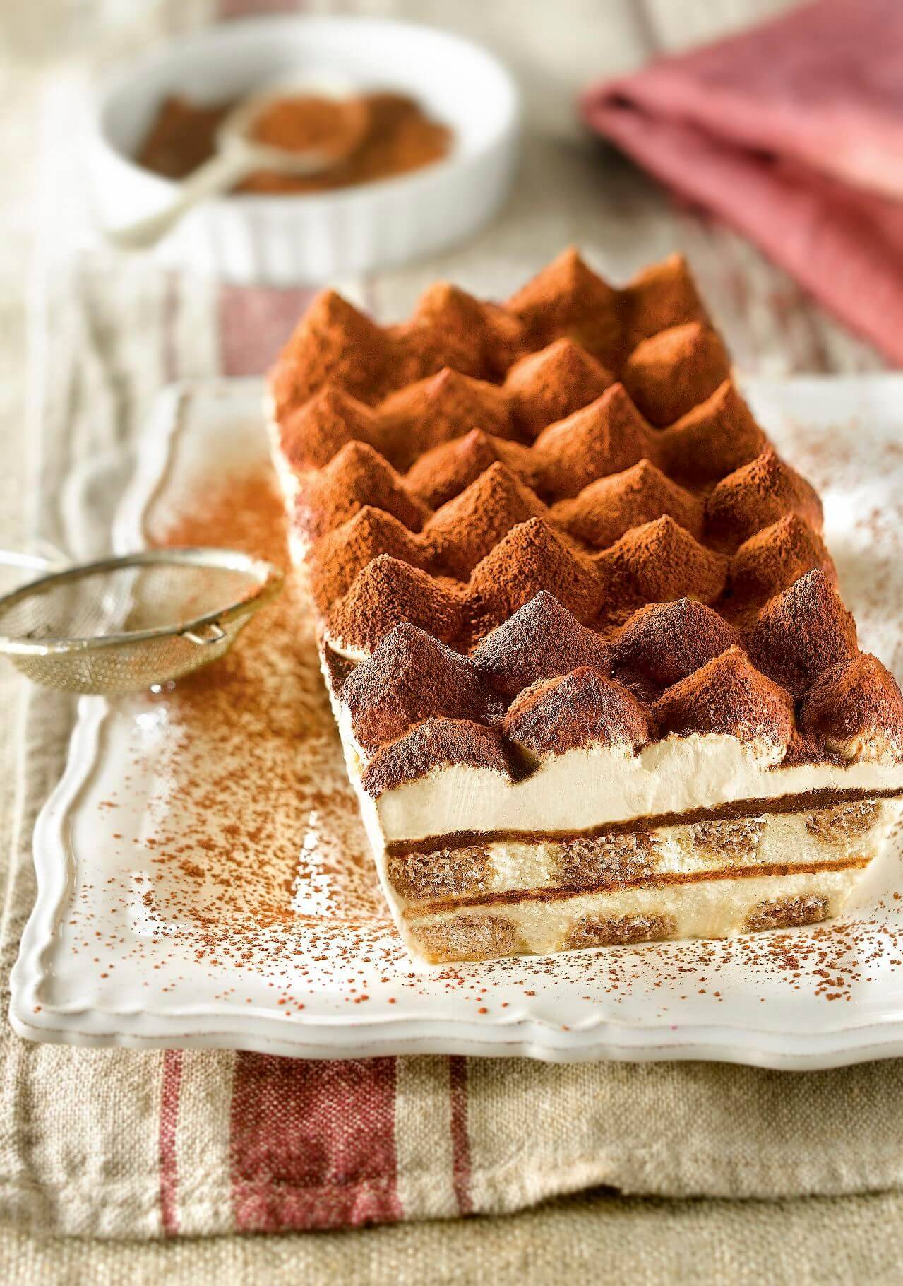 Démoulez le tiramisu en tirant délicatement sur les bords du film alimentaire et transférez-le dans un plat de service. Saupoudrez généreusement le gâteau de cacao en poudre, tamisé à travers une passoire fine, afin qu’il soit entièrement enrobé. Réservez au réfrigérateur jusqu’au moment de servir.