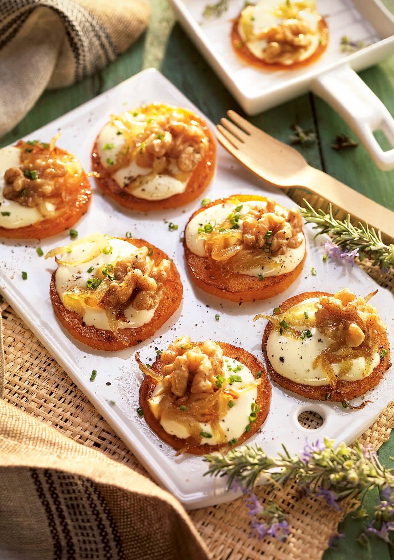 Répartissez ensuite l’oignon et ajoutez une demi-noix décortiquée par-dessus. Faites rôtir pendant deux minutes dans un four préchauffé à 180 °C et servez parsemé de ciboulette.