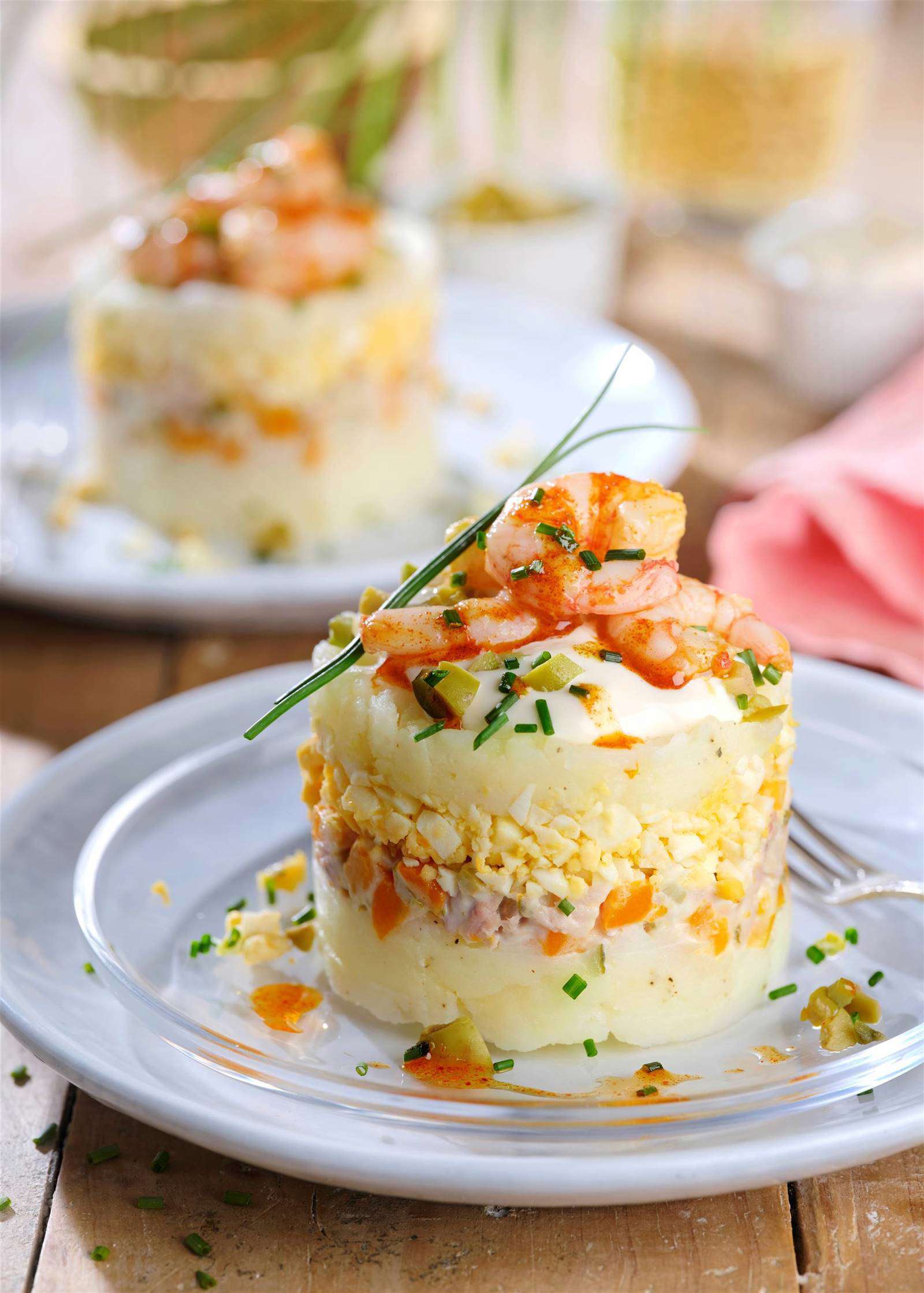 L’astuce : garnissez immédiatement quatre cercles à pâtisserie : une couche de purée de pommes de terre, une couche de salade de pommes de terre, puis une autre couche de purée de pommes de terre. Décorez de mayonnaise, de crevettes et de ciboulette.