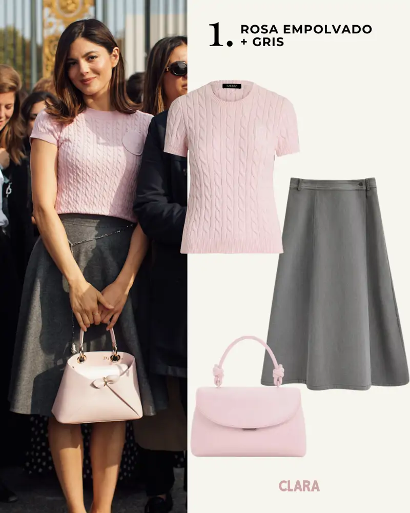 Le rose poudré est une teinte pastel très tendance tout au long de l’année et se marie à merveille avec le gris . C’est une association très facile, car ces deux couleurs sont parmi les plus polyvalentes et s’accordent avec toutes sortes de tenues. On a pu voir ce duo dans les collections de marques comme Kiko Kostadinov, Valentino et Ganni.