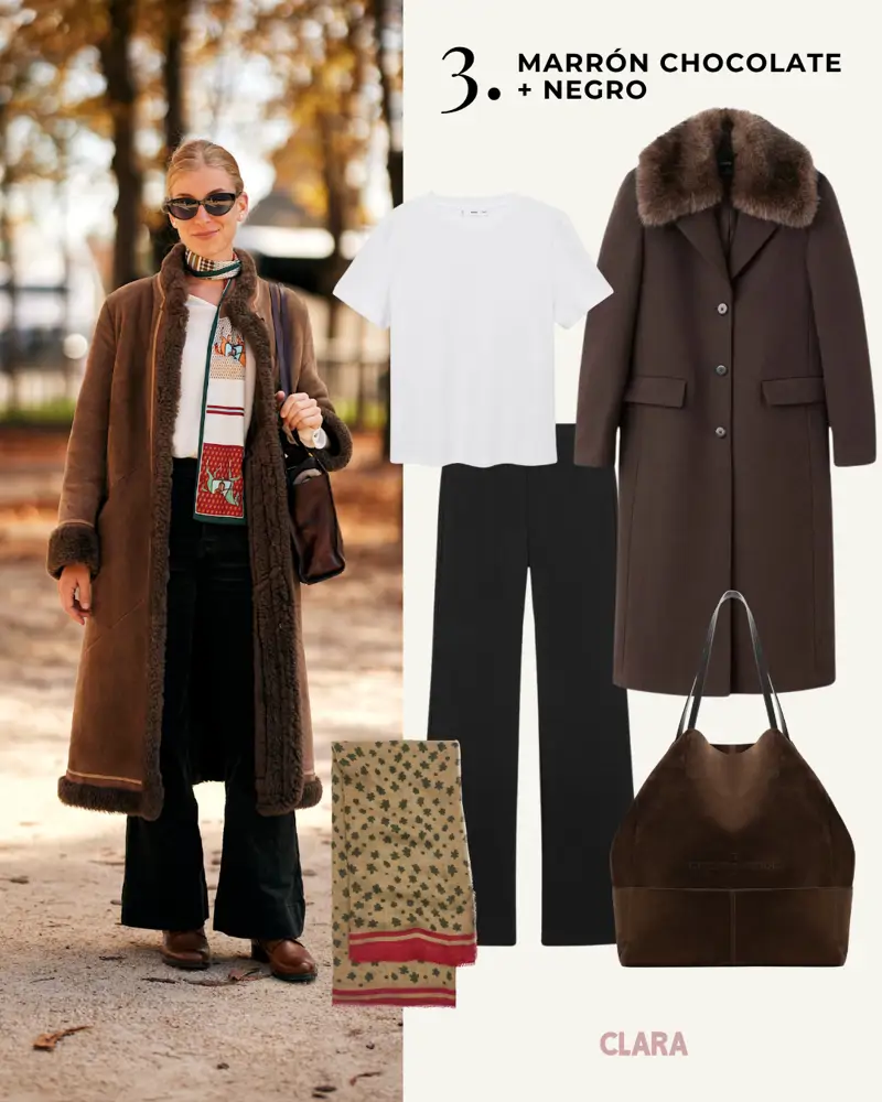 Dans la plupart des cas, on retrouve une formule très simple : un jean noir associé à une veste ou un manteau marron chocolat. Le reste des accessoires peut être de l’une ou l’autre couleur. Pour une touche d’élégance, les foulards à motifs sont indispensables.