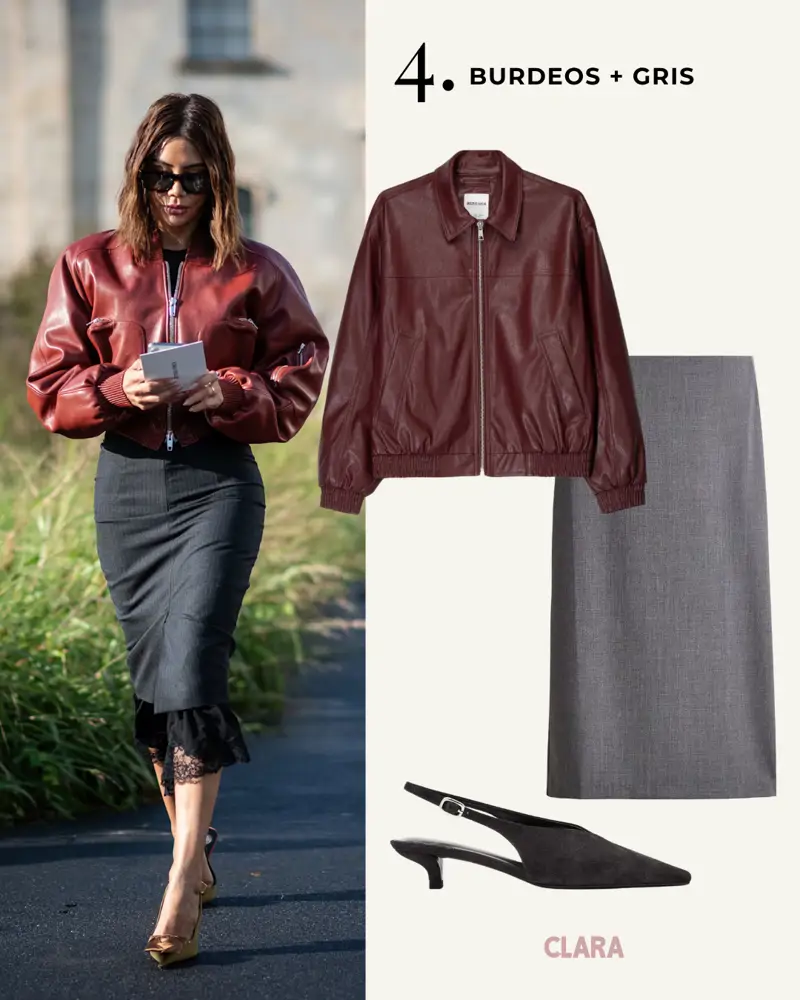 Le bordeaux est la couleur phare de chaque automne, et cette année ne fait pas exception. On le verra partout, des vestes aux tailleurs, associé à des pantalons ou des jupes grises .