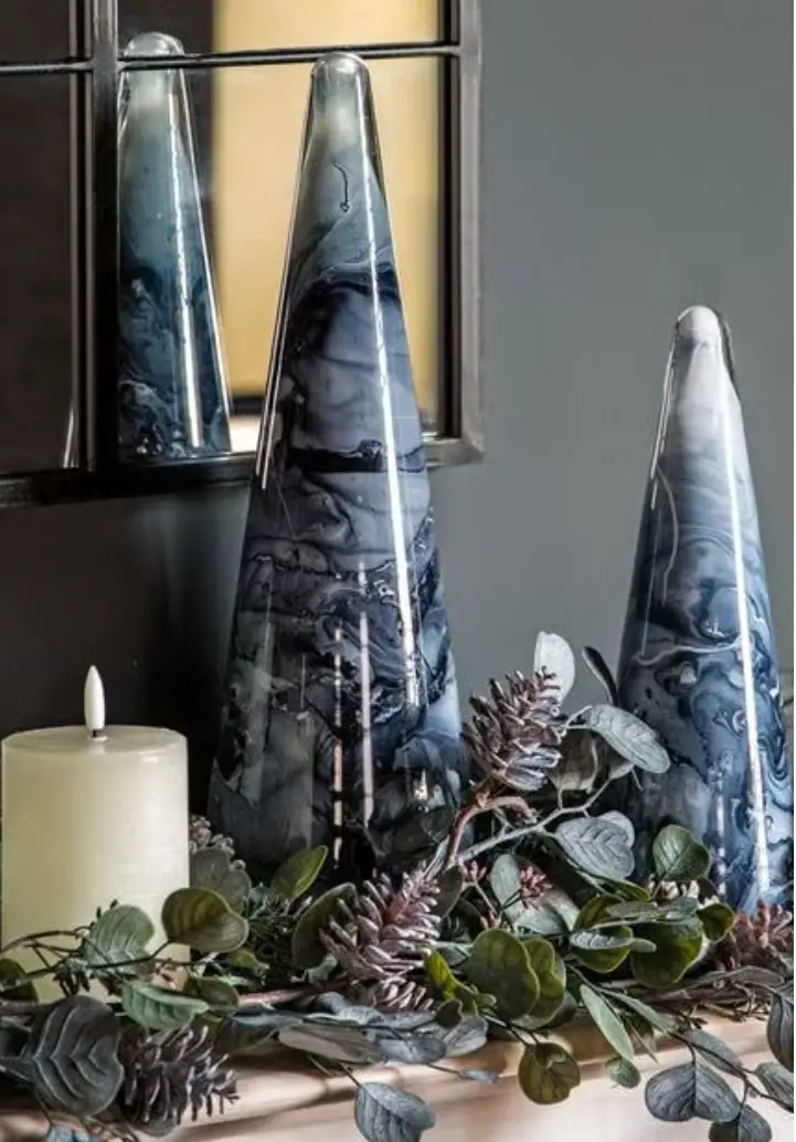 La finition albâtre apporte une touche d’élégance à un plan de travail ou à une belle cheminée. Les ornements coniques, éléments décoratifs intemporels, s’harmonisent parfaitement avec les bougies blanches traditionnelles, même si, dans ce cas, elles intègrent des LED.
