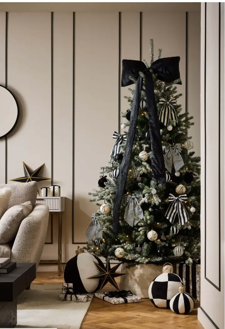 Les nœuds rayés noirs et blancs, les boules de Noël en velours et le grand nœud en velours qui sert de cimier au sapin viennent tous de chez Next Home.