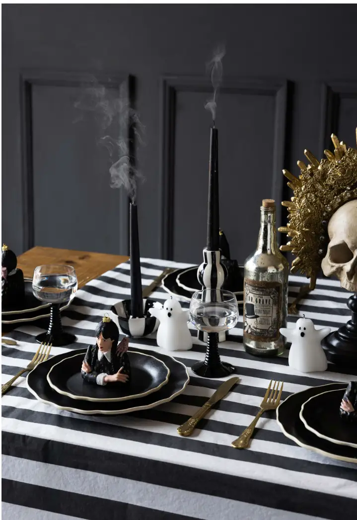 Mélangez éléments vintage et modernes pour une table de Noël classique de style gothique ou un style gothique plus traditionnel pour des décorations de fêtes festives. Ici, des rayures contemporaines se mêlent à des bouteilles anciennes et des crânes décoratifs.