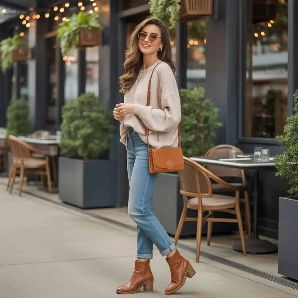 Les bottines, qu’elles soient en cuir lisse ou en daim, allongent visuellement la jambe et apportent une touche sophistiquée. Quelques bijoux dorés suffisent à illuminer la tenue sans la surcharger. C’est le type de look que l’on adopte instinctivement, car il fonctionne en toutes circonstances — simple, efficace et toujours élégant.