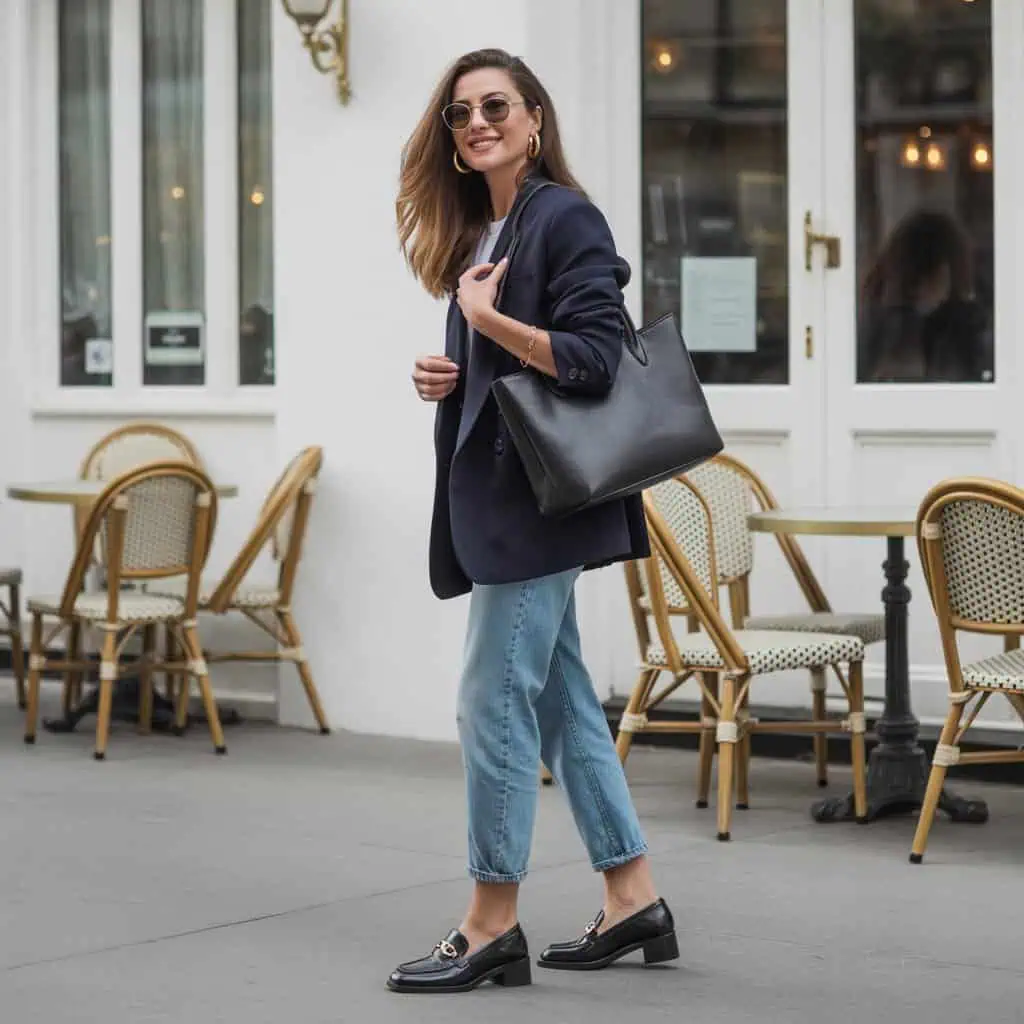 Les mocassins, plats ou légèrement compensés, viennent renforcer l’élégance de l’ensemble tout en garantissant un confort optimal. Ce look fonctionne aussi bien pour une journée active que pour un déjeuner en terrasse. Pour parfaire l’allure, on mise sur un cabas structuré et quelques accessoires minimalistes, dans une logique de dressing fonctionnel et bien pensé.