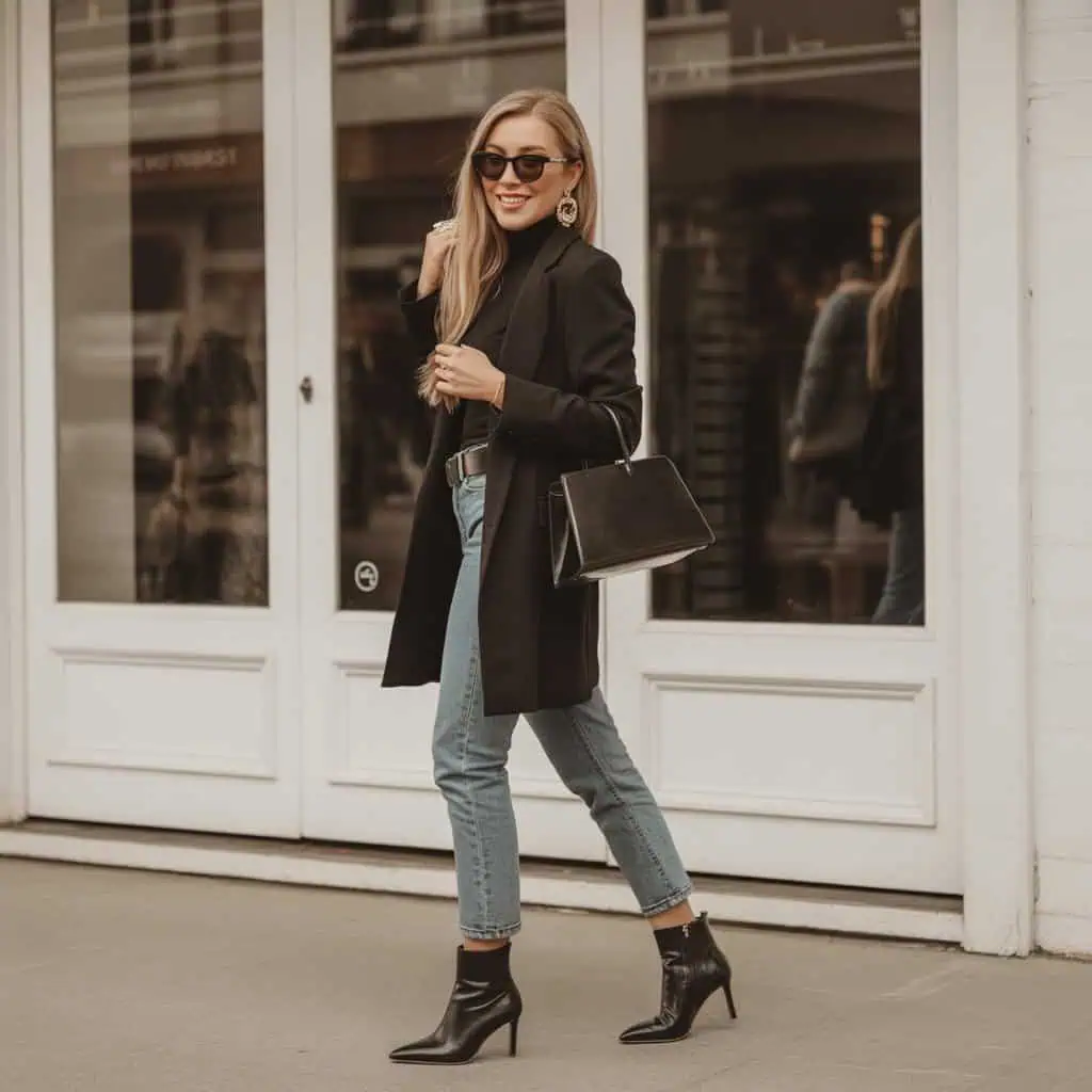 5. Jean cigarette + col roulé noir + ceinture élégante