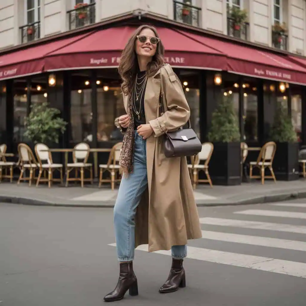 Le trench-coat est sans doute l’un des manteaux les plus emblématiques du vestiaire parisien. Associé à un jean cigarette, il crée une silhouette élancée et très harmonieuse. Ce duo fonctionne particulièrement bien à la mi-saison, lorsque les superpositions deviennent essentielles.