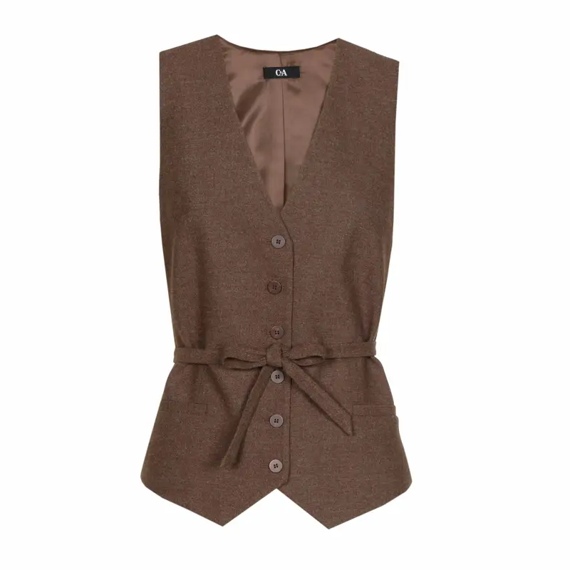 Cette pièce est basique et classique, mais avec une touche de modernité. C’est un gilet sans manches avec un décolleté en V profond, des boutons centraux et une ceinture ornée d’un nœud central pour plus de style.