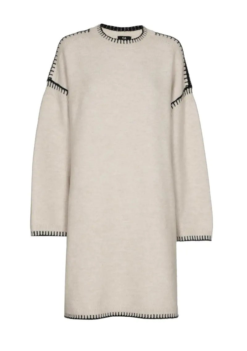 Cette robe blanche est rehaussée de surpiqûres noires contrastantes sur les manches et l’ourlet. De style pull, elle se porte parfaitement avec des bottes hautes.