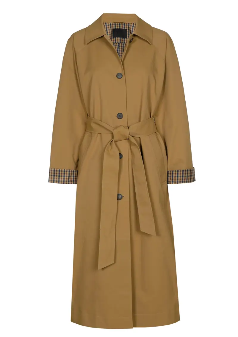 Oversize et long, il arbore un beige foncé sophistiqué et une doublure à carreaux contrastante visible sur les manches. Il est également doté d’une ceinture assortie qui stylise la silhouette. Un oui sans équivoque.