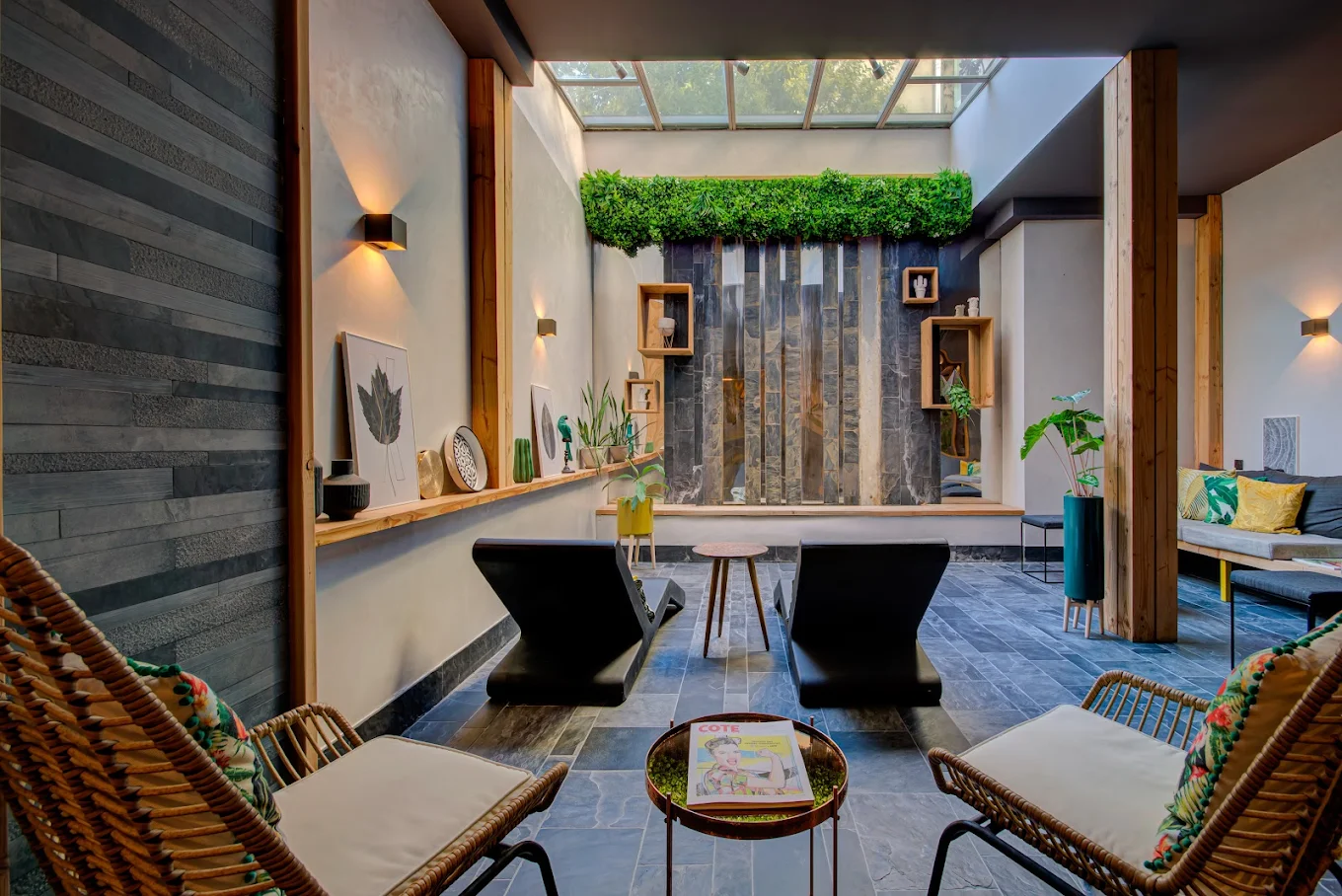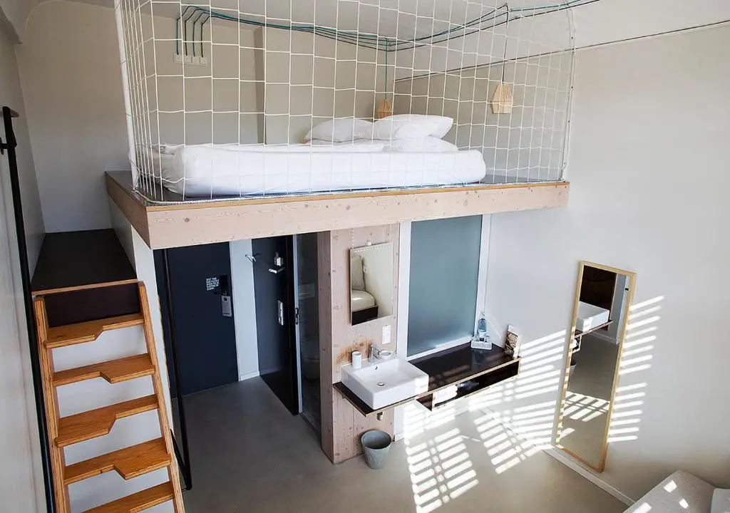 Le hall est un décor à lui seul : hauts plafonds, livres, assises patinées, luminaires poétiques… et cette sensation d’être dans un salon géant où l’on aurait envie de passer la soirée. Les chambres sont classées par “concept” plutôt que par simple taille : certaines sont de vrais nids ingénieux en bois, d’autres poussent le minimalisme très loin, avec une approche quasi spa (bois clair, lignes nettes, calme).