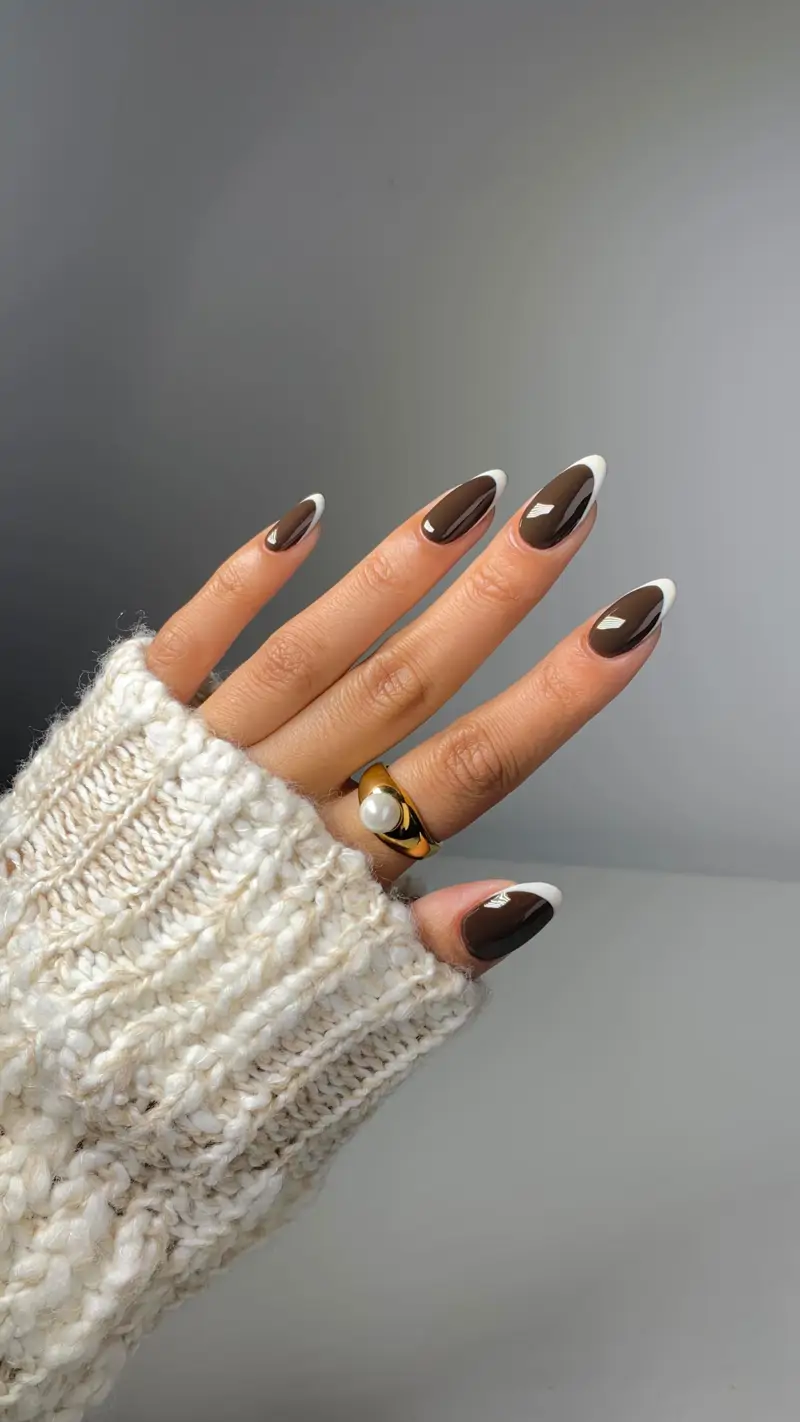 La manucure française classique se réinvente sans cesse. Au lieu de la traditionnelle base claire ornée d’un liseré blanc au bout des ongles, cette version opte pour un vernis brun foncé.