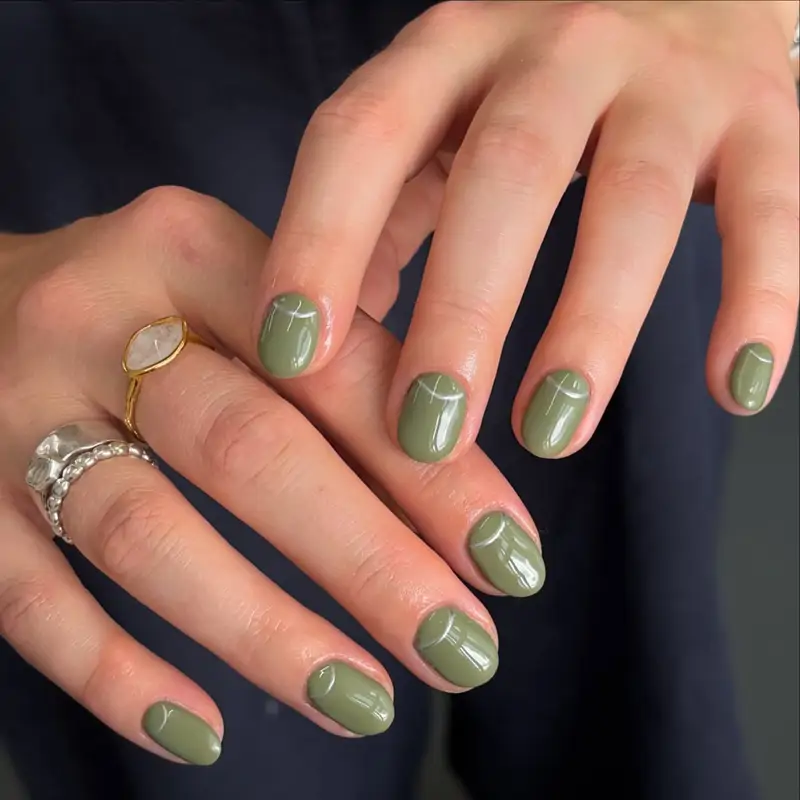 Le vert olive s’impose comme l’une des couleurs phares de la saison, sans oublier l’élégant brun chocolat. Sophistiquées et discrètes en elles-mêmes, ces teintes se modernisent facilement grâce à l’ajout de lignes métalliques, que ce soit avec une manucure française classique ou en créant un demi-cercle à la base de l’ongle.