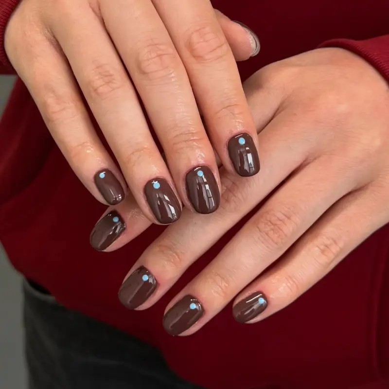 Pour une manucure à pois élégante et discrète , optez pour une base brune et de petits pois de couleur contrastante à la base de l’ongle.