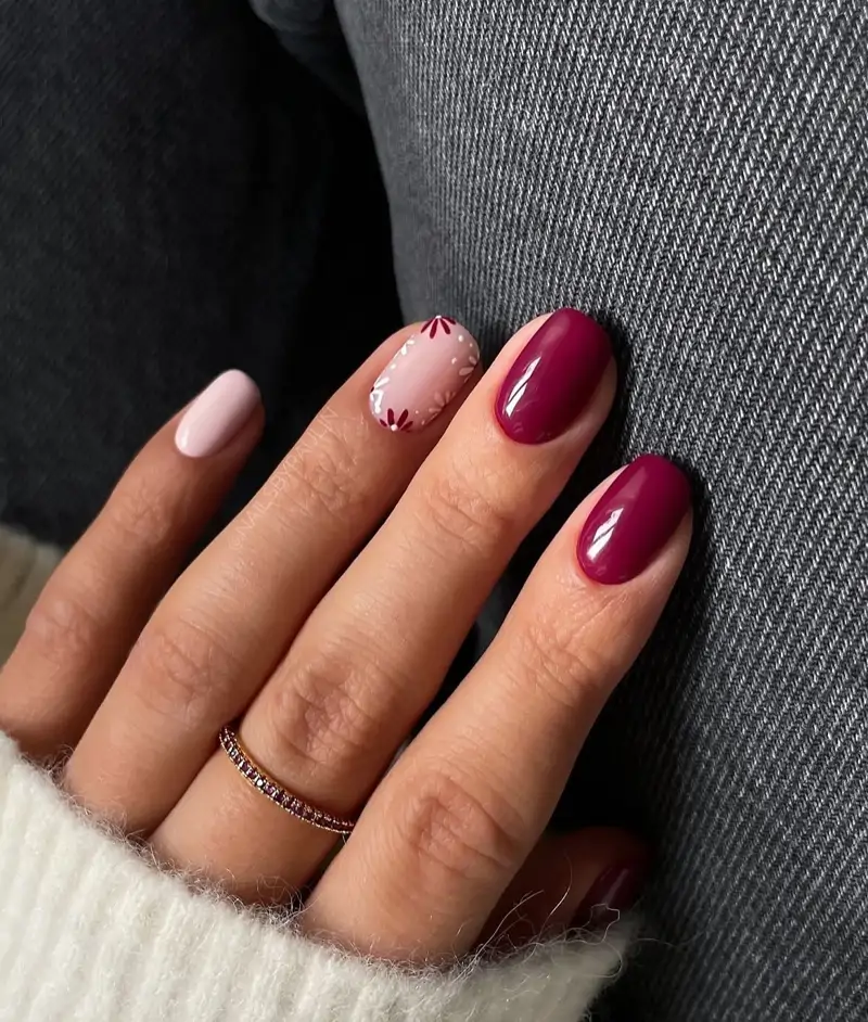 Les manucures florales minimalistes misent sur la subtilité : certains ongles sont ornés de délicates fleurs, tandis que les autres restent unis, créant un contraste élégant.