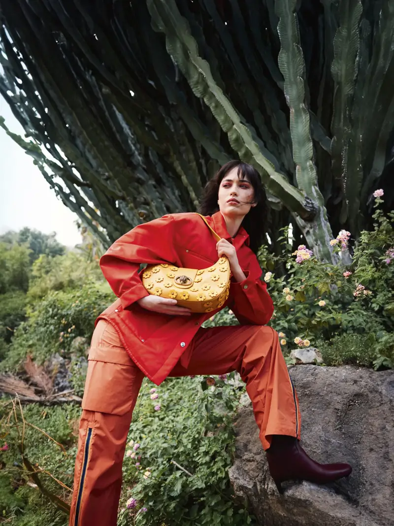 Le rouge et l’orange semblent difficiles à associer, même si c’était une combinaison prisée par des créateurs comme la française Sonia Rykiel et ses rayures emblématiques. Ici, le sac bleu glacier offre un contrepoint parfait.