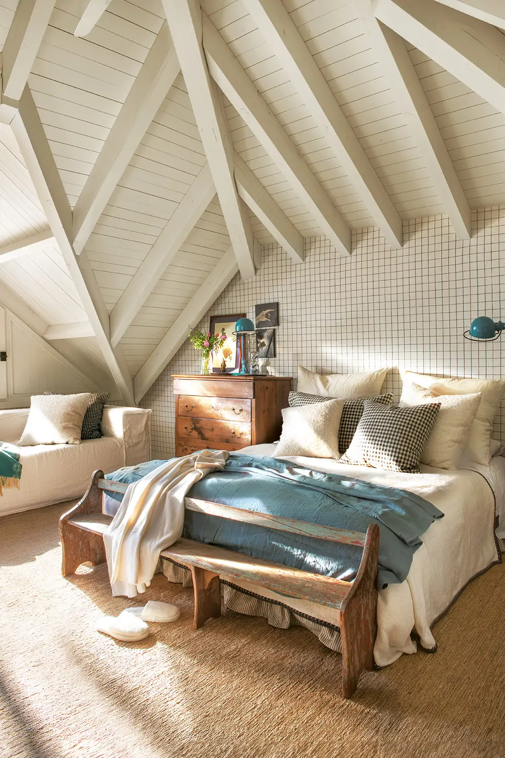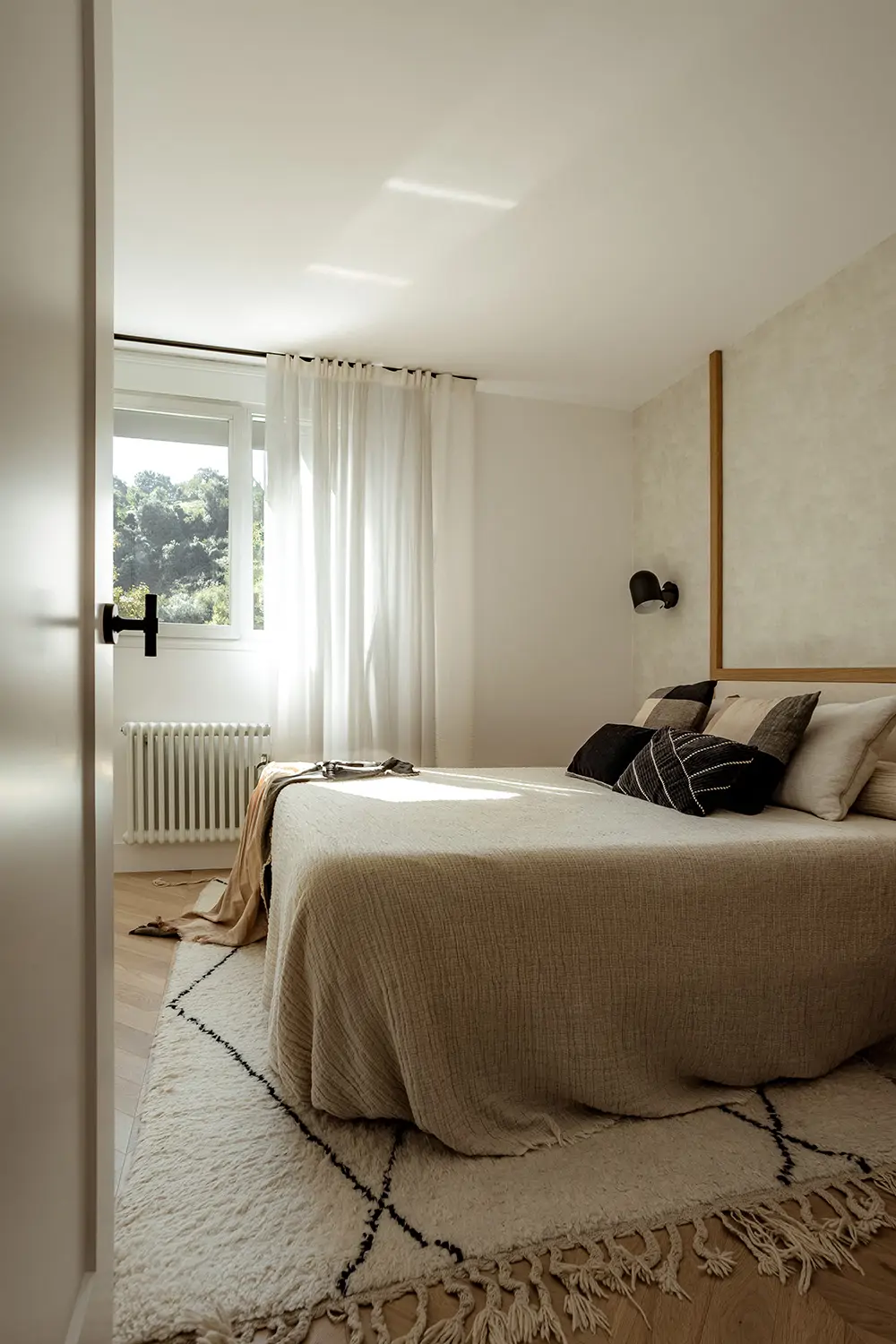 Un couvre-lit en coton, quelques coussins en maille épaisse et des rideaux fluides peuvent suffire à créer une ambiance harmonieuse et douce, sans effet d’encombrement visuel.
