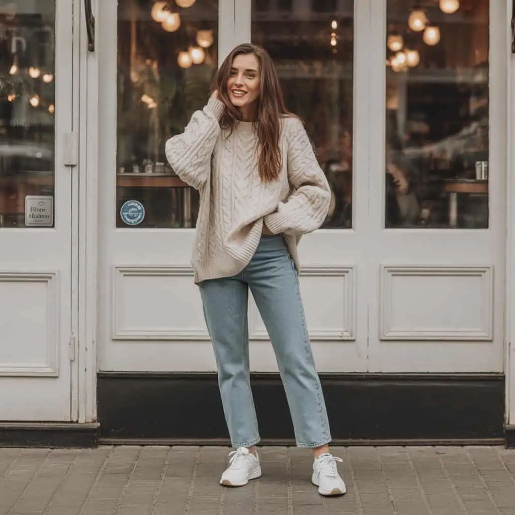 Associer un jean droit à un pull ample en maille torsadée crée un look alliant parfaitement confort et style.