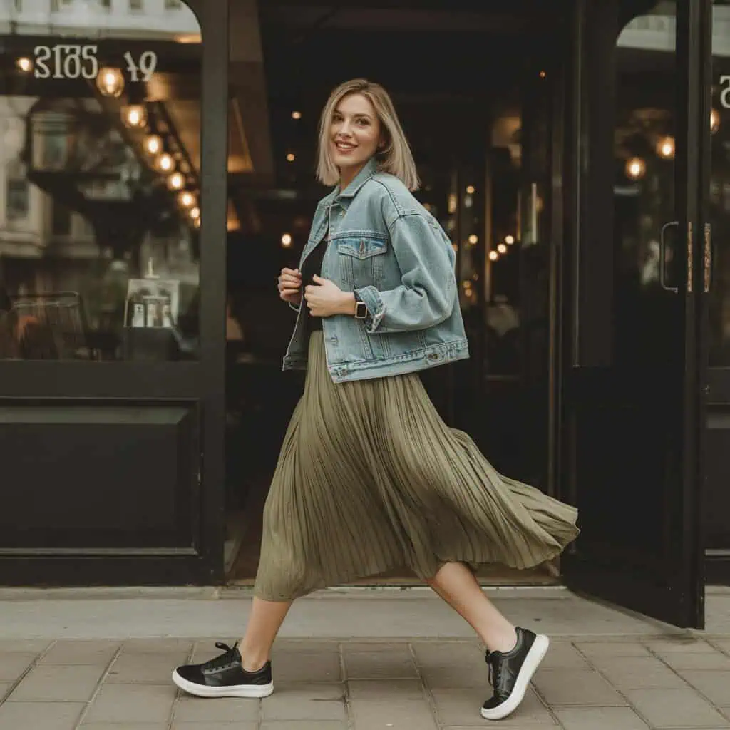 Porter une jupe midi fluide et décontractée avec une veste en jean peut transformer votre tenue pour cet automne/hiver 2026 avec des baskets bien évidemment.