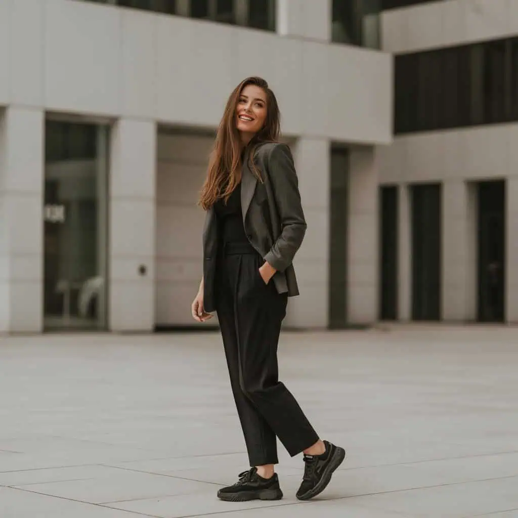 Associer un pantalon de tailleur à un blazer ajusté a quelque chose de naturellement sophistiqué, mais l’ajout de baskets noires apporte une touche inattendue à cette tenue raffinée.