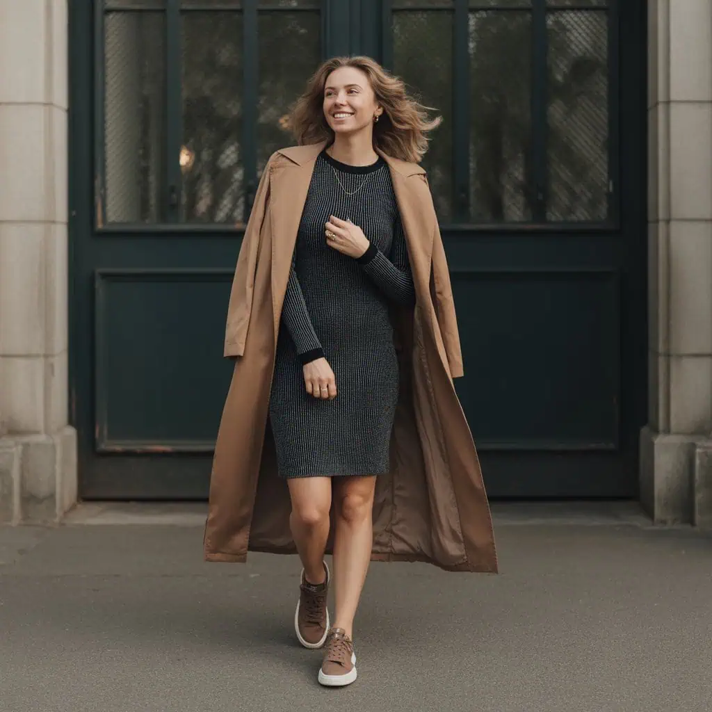 L’alliance du charme féminin d’une robe en maille et de la décontraction des baskets crée une ambiance chic et décontractée, parfaite pour l’automne.