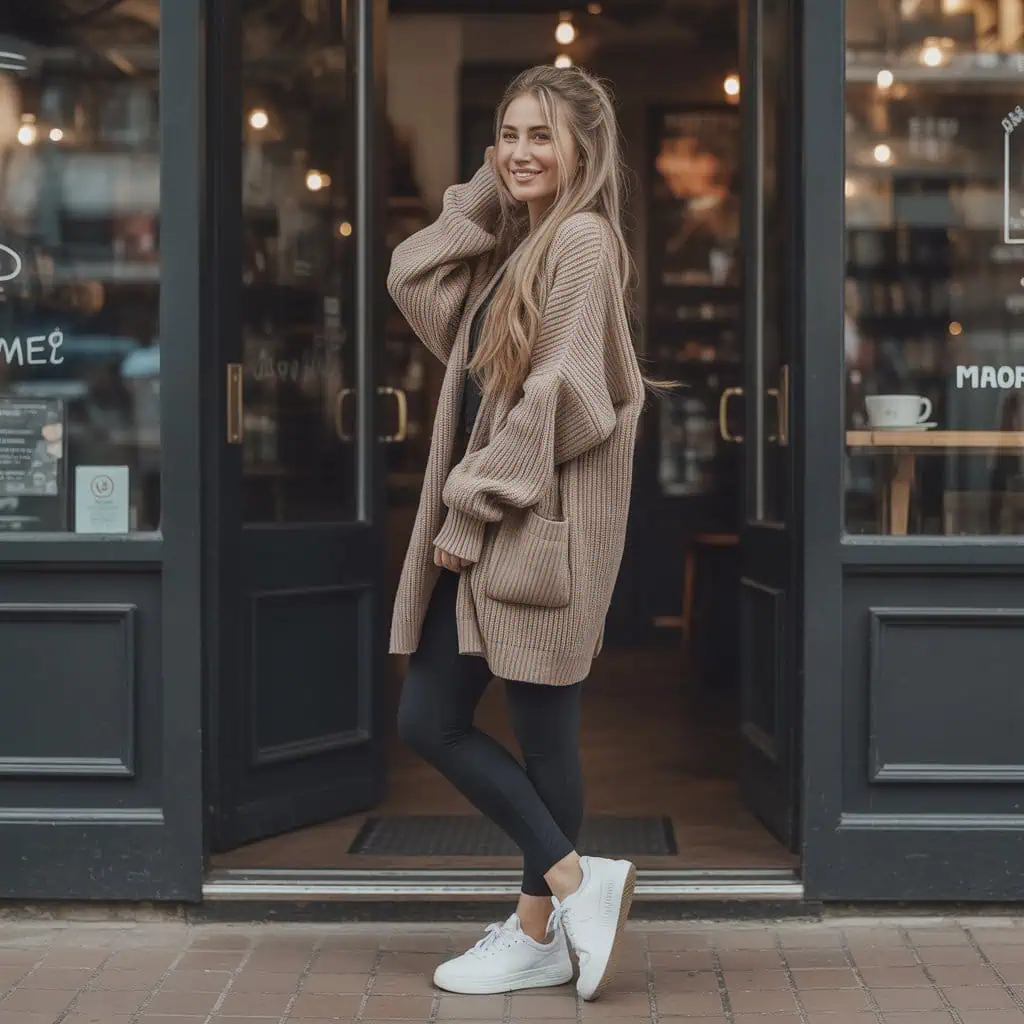 Avec des leggings et un cardigan oversize pour cet automne avec des baskets